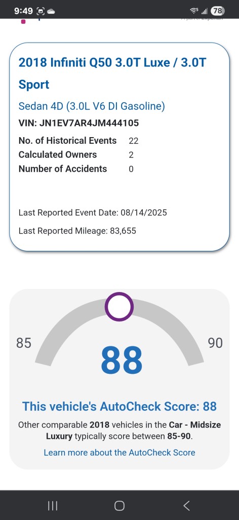 Here is an excellent condition Infinti Q50 that is a 2 owner clean title car with no accidents. Vehicle does everything it should and is fully loaded with great features all the way around. Sunroof, Remote start< passive key with two fobs, heated seats, apple car play, nice tires, great brake pads with 8mm in front and 9/10mm in rear. Very snappy with a 3.0 liter twin turbo. If you are interested in the car please reach out to schedule a test drive today.