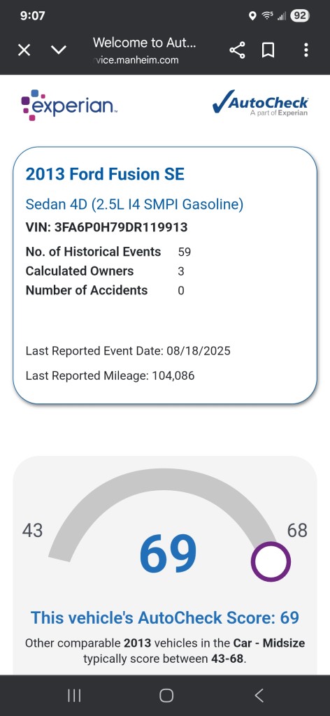 Here is an excellent condition 2013 ford fusion 2.5 liter Duratec clean title car with great service history and lots of 100,000 mile preventative maintenance just completed. New "OEM" Motorcraft spark plugs, New engine air filter, New cabin air filter, New ac compressor, New thermostat, New tires, Brand new brakes all the way around, Freshly detailed and Sanitized with steam from top to bottom and in great all around shape. Please reach out to schedule your test drive today.